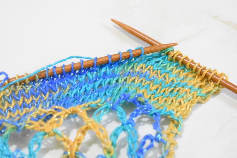 I had some left over yarn from the most recent Fishnet Shawl with Darn Good Yarn's Lace Weight Silk Yarn in Sandy Beach. So my mind instantly went into designer mode. This quick little pattern requires both knit and crochet skills but, I hope you'll enjoy it!